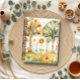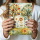 This whimsical notebook cover features a playful folk-art garden scene filled with imaginative trees, blooming flowers, and delicate botanical details. Two stylized trees with patterned trunks and expressive, painterly leaves rise from a gently rolling landscape, surrounded by a cheerful mix of flowers, leaves, and ornamental motifs. Warm earth tones of golden yellow, soft teal, sage green, and touches of coral and rust create a cozy, joyful palette. The hand-painted, watercolor-style textures and charming, slightly abstract shapes give the design a lighthearted, storybook feel—perfect for a notebook meant for journaling, creative writing, or everyday notes.