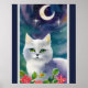 Artistic posters features an AI generated digital watercolor painting of an adorable white and grey cat with cosmic sky background