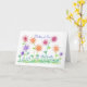 A thinking of you card featuring awhimsical cottage garden with daisy style flowers in pink, orange, and purple.