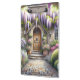 This enchanting scene captures the essence of a storybook cottage garden, bursting with lush blooms and cascading wisteria in soft purples, pinks, and whites. A charming arched wooden door welcomes you through a stone path framed by flowering shrubs, manicured greenery, and dreamy light filtering through the foliage. The overall mood is peaceful, romantic, and full of secret garden nostalgia—perfectly aligned with cottagecore and fairytale aesthetics. The composition draws you inward, evoking a sense of wonder and serenity beneath the floral canopy. AI generated artwork.