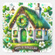 A banner with the words "HAPPY ST. PATRICK'S DAY" are written in elegant script on a brown ribbon-shaped banner. Lanterns are placed on either side of the cottage.