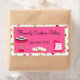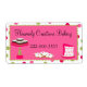 Pretty bakery box label done in a polka dot background, with a pink text area, with a green scalloped edge. Cute graphics of a polka dot cake, platter of brownies, and yummy cookies decorate the text area. The black text is ready to personalise for your business needs.