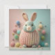 A soft, playful, cuddly knitted bunny in pastel colors with tiny yarn eggs, perfect for Easter greeting cards and spring holiday decor. The design is charming and plush, with a handmade feel and bright, warm, friendly appeal.