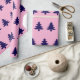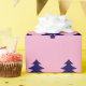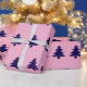 A pattern of dark blue Christmas trees appears on this light pink wrapping paper.