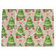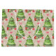 Whimsical decorated Christmas trees have lots of presents around them. A red bow is in between each row of trees. Background is a tan and light tan criss cross lattice work pattern. A fun, festive wrapping paper for young and old alike.