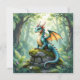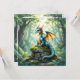 Dragon themed blank card. A whimsical dragon, rendered in a detailed watercolor illustration style, perches atop a moss-covered ancient stone ruin. Sunlight filters through the dense forest canopy, illuminating dust motes dancing in the air. The dragon's scales shimmer with iridescent hues, and its eyes hold a gentle, knowing, fun fantasy art. Cute for a boy's room.