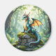 Dragon themed magnet. A whimsical dragon, rendered in a detailed watercolor illustration style, perches atop a moss-covered ancient stone ruin. Sunlight filters through the dense forest canopy, illuminating dust motes dancing in the air. The dragon's scales shimmer with iridescent hues, and its eyes hold a gentle, knowing, fun fantasy art. Cute for a boy's room.