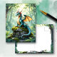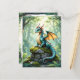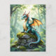 Dragon themed postcard. A whimsical dragon, rendered in a detailed watercolor illustration style, perches atop a moss-covered ancient stone ruin. Sunlight filters through the dense forest canopy, illuminating dust motes dancing in the air. The dragon's scales shimmer with iridescent hues, and its eyes hold a gentle, knowing, fun fantasy art. Cute for a boy's room.