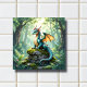 Dragon themed tile. A whimsical dragon, rendered in a detailed watercolor illustration style, perches atop a moss-covered ancient stone ruin. Sunlight filters through the dense forest canopy, illuminating dust motes dancing in the air. The dragon's scales shimmer with iridescent hues, and its eyes hold a gentle, knowing, fun fantasy art. Cute for a boy's room.