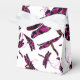 Whimsical purple, pink and black dragonflies scattered with swirls.