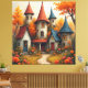 Step into a world of enchantment with this whimsical fairy tale castle illustration, featuring charming storybook towers, warm autumn foliage in rich golds and oranges, and a magical cottage garden pathway. The warm watercolor-style artwork captures the cozy magic of a fall fantasy world, making it a stunning choice for anyone who loves fairy tales, fantasy art, and seasonal decor.