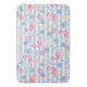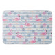 A bath mat with a pattern with a fun summery vibe. Pink flamingos and pineapples set on a light blue striped pattern with leaves and hearts all around.
