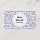 Business cards with a pattern with a fun summery vibe. Pink flamingos and pineapples set on a light blue striped pattern with leaves and hearts all around.