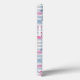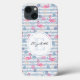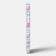 A phone case with a pattern with a fun summery vibe. Pink flamingos and pineapples set on a light blue striped pattern with leaves and hearts all around.
