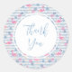 Thank you stickers with a pattern with a fun summery vibe. Pink flamingos and pineapples set on a light blue striped pattern with leaves and hearts all around.