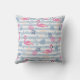 Pillow with a pattern with a fun summery vibe. Pink flamingos and pineapples set on a light blue striped pattern with leaves and hearts all around.