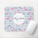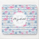 A mouse pad with a pattern with a fun summery vibe. Pink flamingos and pineapples set on a light blue striped pattern with leaves and hearts all around.