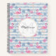 A personalised spiral notebook with a pattern with a fun summery vibe. Pink flamingos and pineapples set on a light blue striped pattern with leaves and hearts all around.