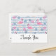 Thank you postcard - a pattern with a fun summery vibe. Pink flamingos and pineapples set on a light blue striped pattern with leaves and hearts all around.