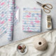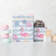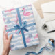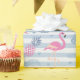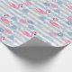 Wrapping paper with a pattern with a fun summery vibe. Pink flamingos and pineapples set on a light blue striped pattern with leaves and hearts all around.