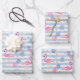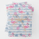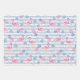 Wrapping paper sheets with a pattern with a fun summery vibe. Pink flamingos and pineapples set on a light blue striped pattern with leaves and hearts all around.