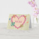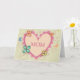 This folded greeting mother's day card has a soft green and white stripes background with a pink whimsical heart in the middle. There are many flowers around the heart along with a few flying butterflies near some swirls. The inside is left blank for you to add your message on the inside.