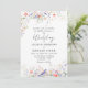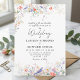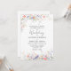 The invitation showcases a hand-painted watercolor frame of soft meadow wildflowers in shades of pastel blue, peach, and lavender. Nestled among the blooms are sweet blue birds symbolizing love, joy, and new beginnings. Elegant serif lettering paired with romantic script typography creates a timeless garden floral wedding invitation style.
