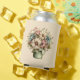 A can cooler with a cute image. Blue. pink and cream colored flowers with green leaves. Set inside a green flower pot with a green plaid cloth hanging over the side.