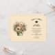 Graduation invitation with a cute image. Blue. pink and cream colored flowers with green leaves. Set inside a green flower pot with a green plaid cloth hanging over the side.