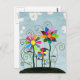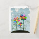 A cute design with whimsical, almost pinwheel type colourful flowers and swirly vines in front of a blue cartoon sky with fluffy white clouds.
