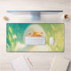 Bring the adorable joy and sunny warmth of spring to your office with this duck desk mat. This delightful whimsical digital painting features an incredibly cute, fluffy white duckling with bright rosy cheek patches and a wonderfully wide, contented smile. The charming duck is nestled low in a sunlit pond, surrounded by lush, tall lime green grass and delicate white daisy flowers. The vibrant background is an artistic wash of deep teal blue blending into bright sunny yellow, giving the impression of light filtering through the water and foliage. Scattered light particles enhance the dreamy, luminous quality of this spring nature scene. This duck desk mat is an ideal accessory for animal lovers, those who appreciate whimsical, cheerful art, and anyone seeking a joyful, artistic, and charming addition to their computer setup.