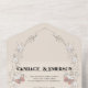 This whimsical yet elegant wedding design has been adapted from an original vintage, Art Nouveau illustration. The wildflowers, mushrooms, frogs, and leaves wrap their way around the entire border of the invitation, making this perfect for an outdoor, magical, or cottagecore event. Hints of champagne and muted reds add to the earthy vibe.
