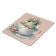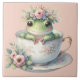 A charming green frog peeks out of a delicate porcelain teacup adorned with soft pink blossoms and gold trim, crowned with a wreath of pastel florals and a tiny royal crown. This endearing scene blends fairytale whimsy with cottagecore elegance, evoking gentle nostalgia and playful storybook vibes. Rendered in a dreamy watercolor style, this sweet composition captures the magic of tea parties and nature’s smallest royalty. Ideal for lovers of frogs, florals, and vintage flair. AI generated artwork.