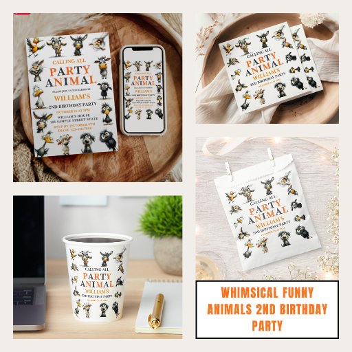 Whimsical Funny Animals 2nd Birthday Party Invitation