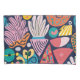 The image is a vibrant and whimsical abstract pattern set against a dark blue background. It features a playful mix of organic shapes resembling flowers, coral, and leaves, alongside geometric forms like circles, triangles, and stripes. These elements are rendered in a bold and colourful palette, with shades of pink, orange, yellow, green, and blue dominating the composition. The textures are diverse, ranging from smooth and flat to patterned and textured, adding depth and visual interest. The overall effect is lively, energetic, and suggestive of a playful and imaginative aesthetic.