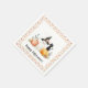A playful Halloween napkin featuring a watercolor ghost in a witch hat, a black cat sitting on a pumpkin, and soft autumn greenery. With a dotted fall border in warm tones, this design adds a spooky-cute touch to trick-or-treat celebrations.