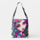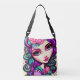 This is a fun crossbody bag featuring a whimsical illustration of a girl in purple, pink and turquoise on a light yellow background.