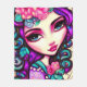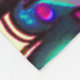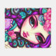This is a fun fleece blanket featuring a whimsical illustration of a girl in purple, pink and turquoise.