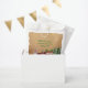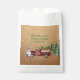 These cute Christmas favour bags feature a rustic red truck with three gnome kids in the back. Daddy Gnome is standing in front of the truck. Typography says Thank you for coming to our annual Christmas holiday party. Snow is falling all around them and there are stars twinkling in the sky. Background is a faux kraft paper look.