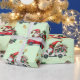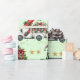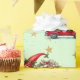 Whimsical gnomes with red, green and white vintage trucks with the backs filled with wreaths, Christmas trees, wrapped gifts and Christmas stockings. Background is a pale green with gold foil stars twinkling all around.