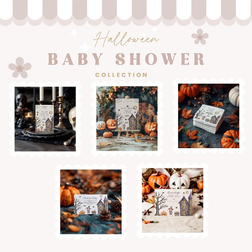 This sweet Halloween baby shower design features hand-painted purple witches, pumpkins, and a cosy haunted house. Perfect for a fall celebration with a whimsical, gentle aesthetic. A lovely choice for parents who love soft Halloween colours and playful cottagecore charm.