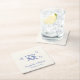 Romantic light cream coasters for your engagement party, rehearsal dinner, wedding reception, party favors, etc., featuring whimsical french blue hand-drawn illustrations of a heart, stars and toasting wine glasses, and the names of the bride and groom in a playful blue script.
