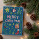 Send joy this season with a whimsical Christmas card featuring hand-drawn scribbles of mistletoe, trees, baubles, stars, and snowflakes. A playful yet heartfelt way to connect with loved ones and share festive cheer that feels personal and unique. Set on a blue background.