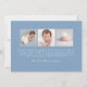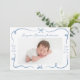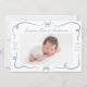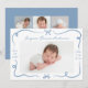 Celebrate your baby’s arrival with this sweet birth announcement featuring hand-drawn dusty blue ribbons and bows framing your little one’s horizontal photo on the front. Personalise with your baby’s name and birth stats in a charming handwritten script. The back displays a 3-photo collage with space for a custom message. This soft blue design is perfect for baby boys or any family seeking a classic, timeless birth announcement.
