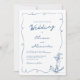 This whimsical hand drawn white and navy blue nautical wedding invitation features a squiggly frame with an anchor in the lower right corner.