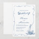 This whimsical hand drawn white and navy blue nautical wedding invitation features a squiggly frame with a sailboat in the lower right corner.