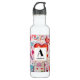 Water bottle with a whimsical pattern. Scrapbook style doodles and scribbles. Red and pink hearts and various letters and envelopes scattered all around.