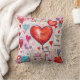 A pillow with a whimsical pattern. Scrapbook style doodles and scribbles. Red and pink hearts and various letters and envelopes scattered all around.