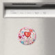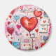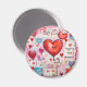 Event magnet with a whimsical pattern. Scrapbook style doodles and scribbles. Red and pink hearts and various letters and envelopes scattered all around.