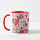 A mug with a whimsical pattern. Scrapbook style doodles and scribbles. Red and pink hearts and various letters and envelopes scattered all around.